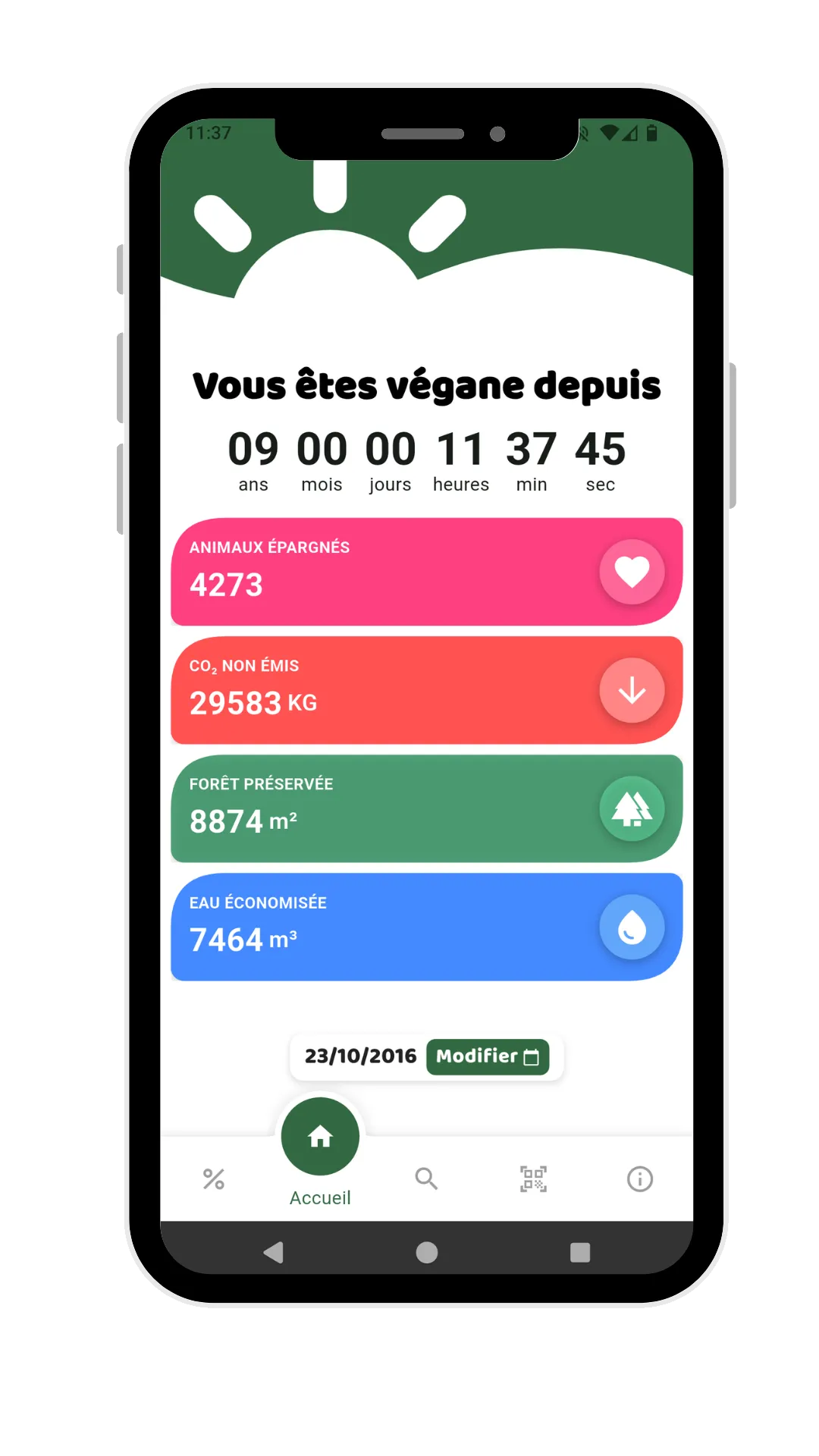 Visualisez combien d'animaux vous auriez consommé sans être végane, combien de CO₂ vous avez évité d'émettre, combien de mètres carrés de forêt ont été préservés et combien de litres d'eau vous avez économisés depuis que vous avez adopté un mode de vie végane.